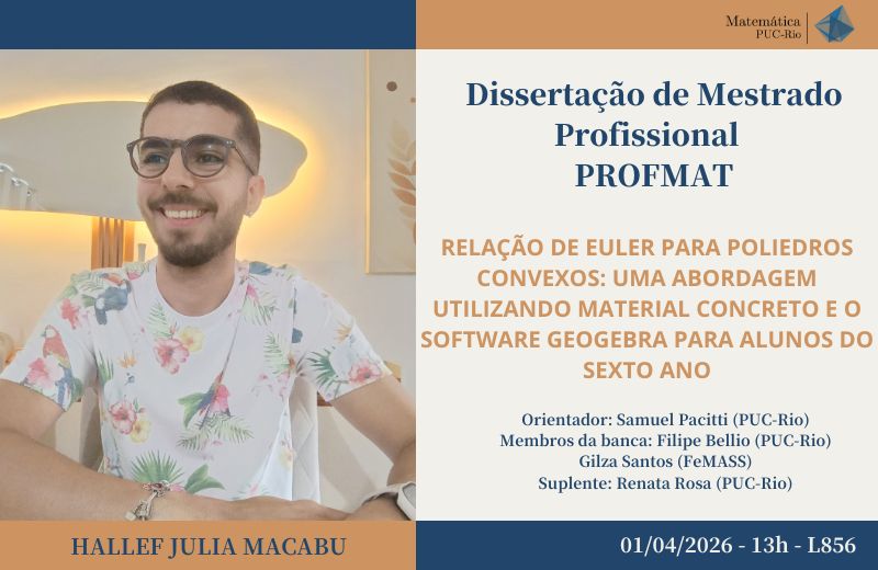 Resumo: Este trabalho analisa o ensino da relação de Euler para poliedros convexos no contexto do ensino de Geometria nos anos finais do Ensino Fundamental. O ensino de Geometria é reconhecido como componente essencial pela Base Nacional Comum Curricular (BNCC).