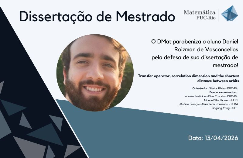 O DMat parabeniza o aluno Daniel Roizman de Vasconcellos pela defesa de dissertação de mestrado realizada no dia 13 de abril de 2026.