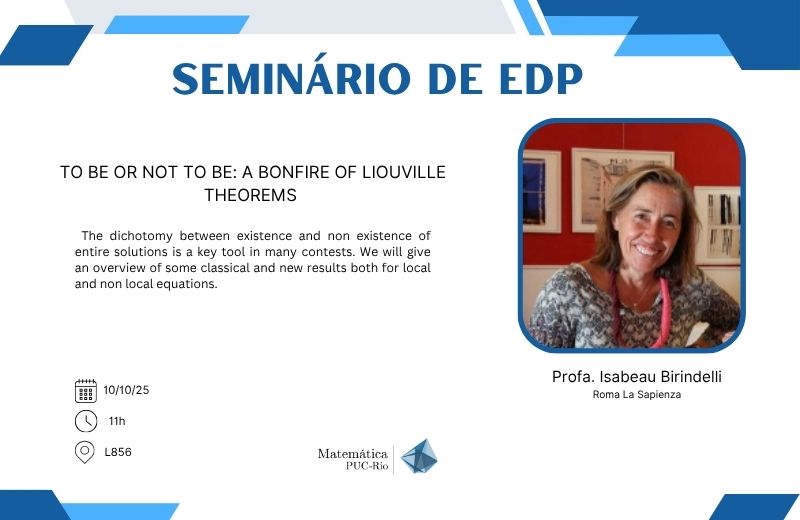 Na sexta-feira, 10 de outubro, teremos um seminário ministrado pela Profa. Isabeau Birindelli (Università di Roma La Sapienza), às 11h, na PUC-Rio, Departamento de Matemática, Sala 856.