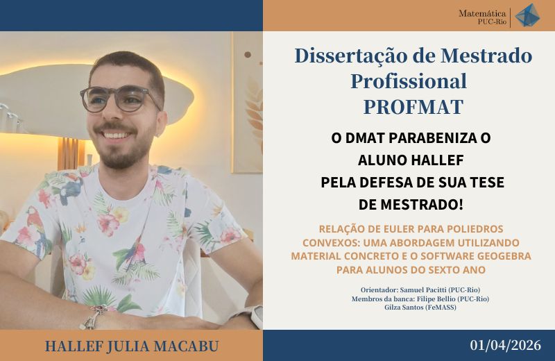 O DMAT parabeniza o aluno Hallef Júlia Macabu pela aprovação na defesa de sua dissertação de mestrado profissional, realizada no dia 01 de abril de 2026.