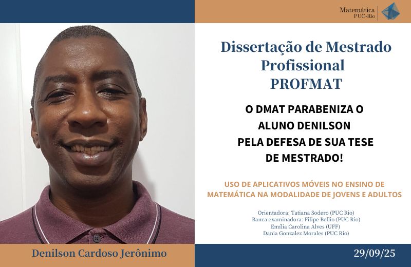 O DMAT parabeniza o aluno Denilson Cardoso Jerônimo pela aprovação na defesa de sua dissertação de mestrado profissional, realizada no dia 29 de setembro de 2025.