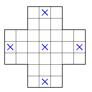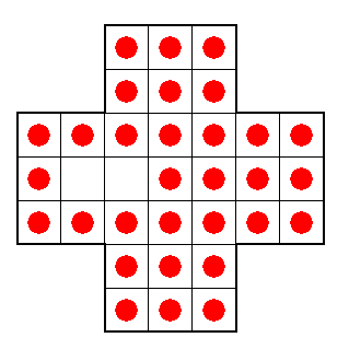 (4b) Com as mesmas regras mas outro tabuleiro, agora quadrado como mostrado na figura, diga se é possivel resolver o quebra-cabeça (isto é, deixar um único pino no final).